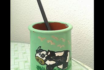 Como todos tenemos un origen...de vez en cuando os voy poniendo en el Blog trabajos que hice cuando era más chiquilla. En esta ocasión se trata de un vasito de cuajada que se lo decoré a mis padres con una vaquita.
