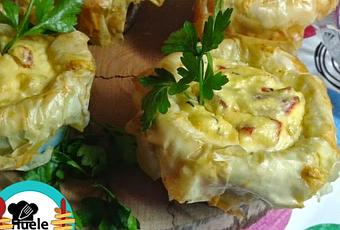 3.- Pincelmos 4 hojas de pasta philo con margarina. Disponemos cuatros hojas de pasta, una encima de la otra, en una superficie de trabajo limpia. Partimos por la mitad en cuatro cuadrados del mismo tamaño. Engrasamos varios moldes pequeños, los forramos con los cuadro de pasta brick. Rellenamos con la preparación de requesón y pimientos. Los colocamos en una bandeja de horno. Añadimos el queso rallado y horneamos 20 minutos a 180ºC. Los desmoldamos cuando estén tibios.
