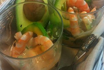 Se enfría en la nevera. Cuando se sirvan se decoran con los langostinos pelados restantes y con las láminas de aguacate.