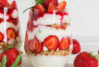 Se trata de un vasito de fresas con queso crema y un poquito de granola.