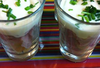 Se montan los vasitos, disponiendo abajo el queso picado, encima el jamón y se salsea con la crema de yogur.