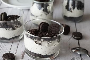 - Prepara los vasitos de Oreo y queso crema poniendo una capa de galletas en la base, seguido añade una buena capa de crema de queso y termina espolvoreando un poco de migas de galletas y adorna los vasitos con trozos de galletas Oreo.