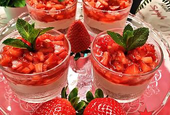 Justo antes de servir cubrimos los vasitos con las fresas maceradas y su jugo. Si tenéis a mano podéis decorar con un ramillete de hierbabuena.