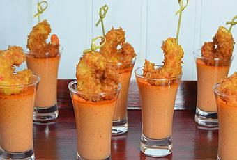 Elaboración :En el robot de cocina trituramos los 3 huevos junto con la salsa de tomate, la albahaca, los piquillos y la nata. Salpimentamos y rellenamos los vasitos . A mi me dio para ocho.Los llevamos al horno previamente caliente . Para ello los ponemos dentro de otra bandeja que sea alta y le ponemos agua para cocerlos al baño maria, durante 15 – 20 minutos a 175º , dependiendo de cada horno. Para ver si están listos, pincháis con un palito de brocheta , si sale prácticamente limpio, estarán listos. No conviene hacerlos en exceso tampoco porque sino se resecarían. Mientras están en el horno, vamos preparando los langostinos.Para ello, los pelamos y los maceramos con un poco de jengibre en polvo , ajo y una pizca de azafrán y una cdita de aceite de oliva virgen. Los dejamos diez minutos que cojan sabor .(Las cabezas y pieles no las tiramos que nos servirán para aprovechar en algún caldo).Después las pasamos por harina, huevo y panko y las freímos en aceite de oliva virgen bien caliente pero sin arrebatar , hasta que se queden doradas. Para presentarlos , los pinchamos en una brocheta y coronamos cada vasito con una.