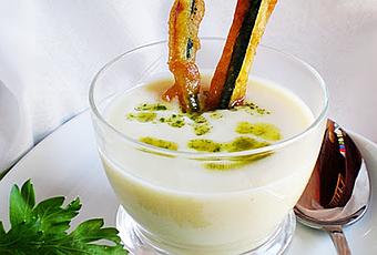 Montar el vaso: poner la crema de coliflor, rociar con unas gotas del aceite de perejil y de pie los bastoncitos de berenjena.