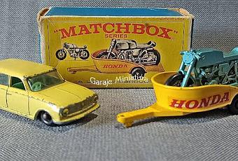 Los lectores del “Garaje Miniatura” han podido leer notas anteriores sobre los Matchbox, que conservo desde mi infancia, que comparten el mismo número de pieza. Hoy le toca el turno a las piezas que comparten el número 38. Son dos modelos: una rural Vauxhall Victor y una motocicleta de carrera Honda con su tráiler.