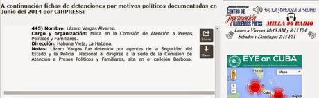 De igual forma, asegura la misma fuente en su Informe, el pasado 13 de junio, el manager del equipo Industriales, Lázaro Vargas Álvarez, supuesto miembro de la Comisión de Presos Políticos y familiares, “fue detenido por Agentes de la Seguridad del Estado y la Policía Nacional al dirigirse a la sede de la Comisión de Atención a Presos Políticos y Familiares, sita en callejón Barbosa, municipio de san Miguel del Padrón, La Habana, para impedir que participara en una actividad. Permaneció bajo arresto durante más de 10 horas”.