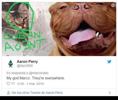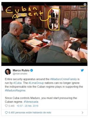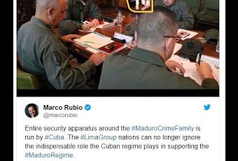 El senador republicano por Florida (EE.UU.), Marco Rubio, feroz crítico reconocido del actual Gobierno de Venezuela, ha afirmado en su cuenta oficial de Twitter que "todo el aparato de seguridad" que rodea al gobierno de Nicolás Maduro "está dirigido por Cuba", y ha manifestado que "las naciones del Grupo de Lima no pueden seguir ignorando el papel indispensable que juega el régimen de Cuba en apoyo del régimen de Maduro".El mensaje ha generado una gran cantidad de respuestas, muchas de ellas abiertamente burlescas, debido principalmente a la imagen que lo acompaña: se trata de una fotografía de una reunión de altos militares venezolanos en una sala en cuya entrada se aprecia, en segundo plano, una persona. En una edición rudimentaria de la imagen, Marco Rubio rodea esta figura en el fondo de la imagen y la señala como "agente cubano".