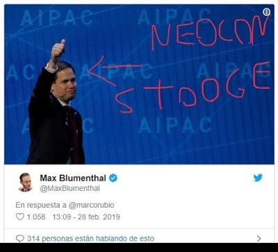 Las respuestas no se hicieron esperar indica RT. Una de ellas fue la del escritor, periodista y bloguero estadounidense Max Blumenthal, que contestó con una imagen del propio Marco Rubio sometida a una edición igual de precaria, en la que el senador estadounidense aparecía también señalado, esta vez como "títere neoconservador":