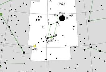 Pero hay otros lugares interesantes en la constelación: Epsilon Lyrae, es conocida como la “doble-doble” estrella. Las personas con buena vista descubren que Epsilon es realmente un par de estrellas. Con prismáticos se separan fácilmente las dos, mientras que un telescopio moderadamente grande se muestran cada una dividida de nuevo en dos estrellas. Así como una nebulosa espectacular, M57 la nebulosa del anillo.