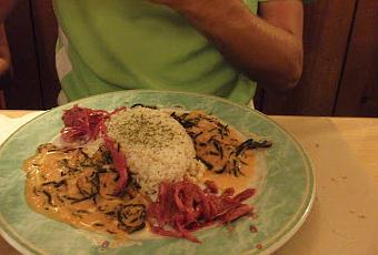 Yo comí un bocata de gluten con queso, aguacate, tomate, lechuga y salsa roquefort y unas patatas al chef (con champiñones). El gluten era gluten de trigo y por eso lo que trajeron era seitan casero.