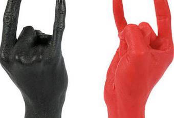 Velas de cera hay de muchos tipos, desde las más clásicas de cera blanca hasta las aromáticas o las que repelen insectos. Pero hasta ahora no habiamos visto velas especiales para los aficionados al heavy metal. Estas dos particularísimas velas reproducen a escala real el típico gesto que se ve en cualquier concierto metalero.