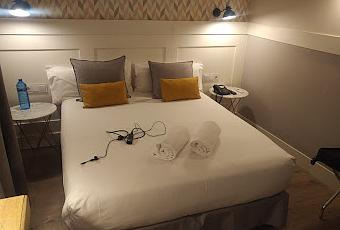 Tras ella, caemos directamente en el espacio del dormitorio. Paredes en beige en la parte de arriba y gris en la parte de abajo. Suelo de madera algo grisácea muy limpia y cuidada. La pared del cabecero está recubierta por un papel pintado en tonos pastel y formas geométricas. Junto a la puerta está la ranura que activa la luz de la habitación, y un par de interruptores. Justo debajo, un maletero de metal con lamas de tela. Y allí mismo, la cama. Vestida en blanco. Grandes para ser individual y algo justa para ser doble. Dispone de unas ruedas que quizá no tienen el freno activado, porque al meternos, se desplaza un poco de la pared. Dos almohadas, dos cojines grises y dos de color caldero. Colchón de buen calibre sobre un canapé recubierto por una tela grisácea. Sobre ella se presentan dos toallas de baño enrolladas. Empotrada sobre una madera labrada en color blanco que recorre toda la pared presenta a cada lado sendas mesillas redondas de patas metálicas finas y tapa de mármol. Sobre ellas enchufes disponibles e interruptores para pagar las luces de la habitación. Por encima del cabecero, anclados a la pared hay dos flexos de aire retro y metal negro que permiten el trabajo desde la cama. En una de las mesillas hay un aparato de teléfono, el mando de la televisión y el mando para el aparato individual de aire acondicionado, que ubicado encima de la puerta de entrada, funciona con cierta efectividad y escasa sonoridad. En la otra mesilla hay una botella de agua mineral grande de cortesía.