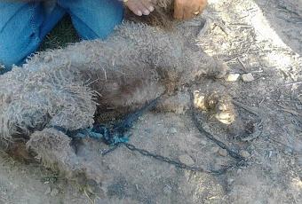 Cuando llegamos nos encontramos con una perra de agua, de dos años aproximadamente, y tremendamente asustada, tenía una pata trasera atada a la cabeza, algo que según nos han dicho suele ser un castigo que hacen los cabreros.