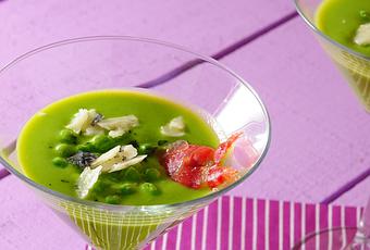Servir en copas individuales acompañado de los guisantes salteados, las lascas de jamón y lascas de queso parmesano, y para darle otra nota de color, unas escamas de sal negra al presentar en la mesa.