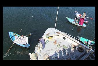 Como si fuesen mariscales de un equipo de futbol americano van lanzando a las manos de los pasajeros, manteles, toallas, chilabas (túnicas) y otras prendas. El dinero vuelve por la misma vía. Las canoas entran a la esclusa empujadas por el barco y continúa el regateo.Como el barco pasa justito, a los costados de la esclusa están apostados curiosos y vendedores sin canoas que actúan de la misma forma. Lanzan los productos y dan un precio alto para luego ofrecer rebajas. Siempre hay gente que compra.El regateo sólo termina cuando las compuertas se abren y dejan continuar el viaje.