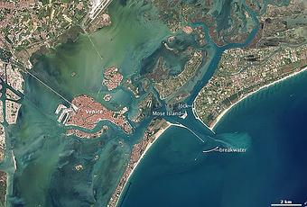 La imágen obtenida por el Land Imager del Landsat 8, tomada en septiembre de 2013, muestra un espigón curvo justo al sur de la escollera de la ensenada así como una nueva isla artificial junto al Lido que alberga los edificios y plantas que operan las puertas que se encuentran bajo el agua.
