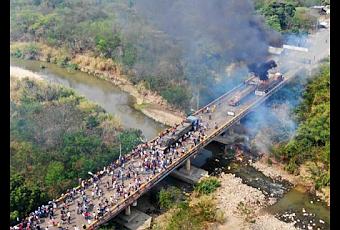 El incendio del camión en el puente Santander, cuyas imágenes han viajado por todo el mundo, parece haber sido iniciado por jóvenes colombianos. A diferencia de la versión que acusaba a las autoridades de la policía de fronteras, las imágenes muestran un cóctel molotov lanzado al camión. La televisión local también pudo filmar la preparación de estos proyectiles in situ. Además, portavoces del gobierno venezolano han proporcionado imágenes que contradicen la versión de un camión que contenía “ayuda humanitaria”, y mostraron los restos humeantes de los kits previstos para ser utilizados en las tácticas de bloqueo de las calles.Bajo el puente de Bolívar, los manifestantes colombianos estaban preparando una incursión en territorio venezolano frente a las cámaras de TV Cúcuta. Refiriéndose a una acción probablemente coordinada con los paramilitares, uno de sus líderes dio una instrucción clara: “Lo que quiero decirles es que tan pronto como regresen allí y los elementos empiecen a rendirse y a tomar posesión de las armas venezolanas, hay que dar de baja a esos bastardos”, es decir, matar a los hombres que se entregarían.