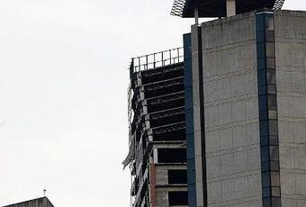 Imagen de la parte superior del rascacielos abandonado inacabado Torre de David, que se inclina en Caracas, este martes 21 de agosto, después de un terremoto de magnitud 7.0 que sacudió en el estado venezolano de Sucre, noreste de acuerdo con el Servicio Geológico de Estados Unidos.