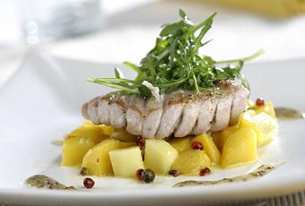 Ingredientes4 porciones de ventresca de atún de 200 gr. cada una, 1 manzana Granny Smith, 1 mango, una nuez de mantequilla, unos granos de pimienta rosa entera, 2 cucharadas de mostaza de Dijon, unas gotas de zumo de limón, pimienta negra recién molida, una cucharada de miel, aceite de oliva, sal y unas hojas de rúcola.La ventresca de atún es una de las partes más sabrosas y jugosas de este saludable pescado azul. En la receta que os presentamos aquí la acompañamos con un salteado de manzana y mango, consiguiendo así un plato muy jugoso, equilibrado y exótico. Buen provecho!Pela la manzana y el mango. Ahora pélalos en dados medianos de igual tamaño.Funde la mantequilla en una sartén amplia. Una vez fundida, agrega los granos de pimienta rosa y los dados de manzana y mango. Sube el fuego y saltea durante un par de minutos. Reservamos.Salpimenta la ventresca y cocínala en una plancha o sartén antiadherente muy caliente, procurando que quede bien dorada por fuera y jugosa en su interior.Emplata el salteado de manzana y mango. Sobre éste disponemos la ventresca de atún ya cocinada.Para terminar, acompañamos con una vinagreta de mostaza, la cual conseguiremos mezclando la mostaza de Dijon con aceite de oliva, unas gotas de zumo de limón, una cucharada de miel, pimienta negra y sal.Coloca unas hojas de rúcola aliñadas sobre la ventresca y sirve al momento.La ventresca podemos marcarla primeramente en la plancha para terminar de cocinarla en el horno. De esta manera nos quedará muy jugosa.El atún nos va a aportar todas las ventajas nutricionales de los pescados azules. Este pescado es muy rico en proteínas de gran calidad y vitaminas, entre las cuales debemos destacar la vitamina D, esencial para la correcta absorción del calcio. También contiene una buena cantidad de minerales, siendo los de mayor relevancia el yodo y el magnesio.Pero lo más interesante del atún es su alto contenido en grasa Omega 3, que nos va a ayudar a reducir los niveles de colesterol y triglicéridos en sangre, así como el riego de contraer enfermedades de carácter cardiovascular.Al acompañar la ventresca con manzana y mango, el plato va a verse enriquecido con vitaminas, minerales, fibra y sustancias de acción antioxidante.Datos nutricionales del atún:Calorías: 226 kcal. /100 gr.Proteínas: 21 gr. / 100 gr.Grasas: 15.5 gr. / 100 gr.Hidratos de carbono: 0 gr. / 100 gr.Índice glucémico (IG): 0Fuente: tusrecetas