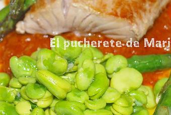 En cada plato ponemos una generosa cama de salsa de tomate, sobre ella la ventresca, a un lado las habas aliñadas y los espárragos a la plancha.