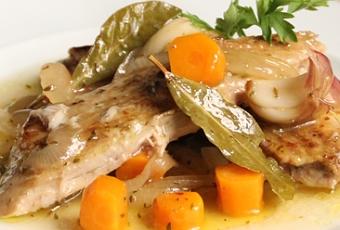 3 – Echar las hojas de laurel, la pimienta y las hierbas, junto con 3/4 de vino blanco seco; 1/4 de vaso de vinagre de jerez y 2-3 vasos de caldo de pescado hecho por nosotros o con una pastilla de caldo concentrado.