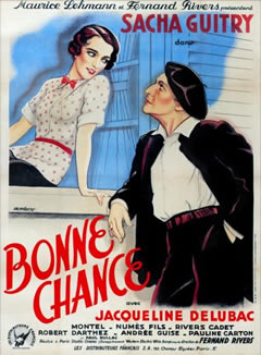 Casado en febrero, ya por tercera vez, con Jacqueline Delubac, Sacha Guitry filma en abril no su debut, pero sí su obra fundacional, la primera de una voraz decena de obras maestras producidas en apenas cuatro años y hasta su divorcio de Jacqueline poco antes del estallido de la Segunda Guerra Mundial; todas menos una, con ella de protagonista.Sus declaraciones (declamaciones más bien: pocas concesiones ni segundas lecturas eran posibles ante sus ingeniosos parlamentos), siempre tan vitriólicas como elusivas, en nada discernían romance de realidad, pero pocas veces en la historia del cine ha virado de tal manera la carrera de un autor ya maduro (tenía cincuenta años) con una vida entregada al teatro, a escribir, lejana e incipientemente a la dirección de películas, ya fuese la veinteañera Delubac divina fuente de inspiración o sólo un afortunado acicate. Muy poco antes, en "Pasteur", su primer largometraje, estrenado simultáneamente con "Bonne chance!" ese año de 1935 (y oscureciéndolo con su éxito de dominical serio), Guitry había ejecutado una suerte de desprendimiento de una serie de lastres de escenario apropiado para su cine subsiguiente. Básicamente incidió en ellos para asegurarse de no volver nunca más a necesitarlos.