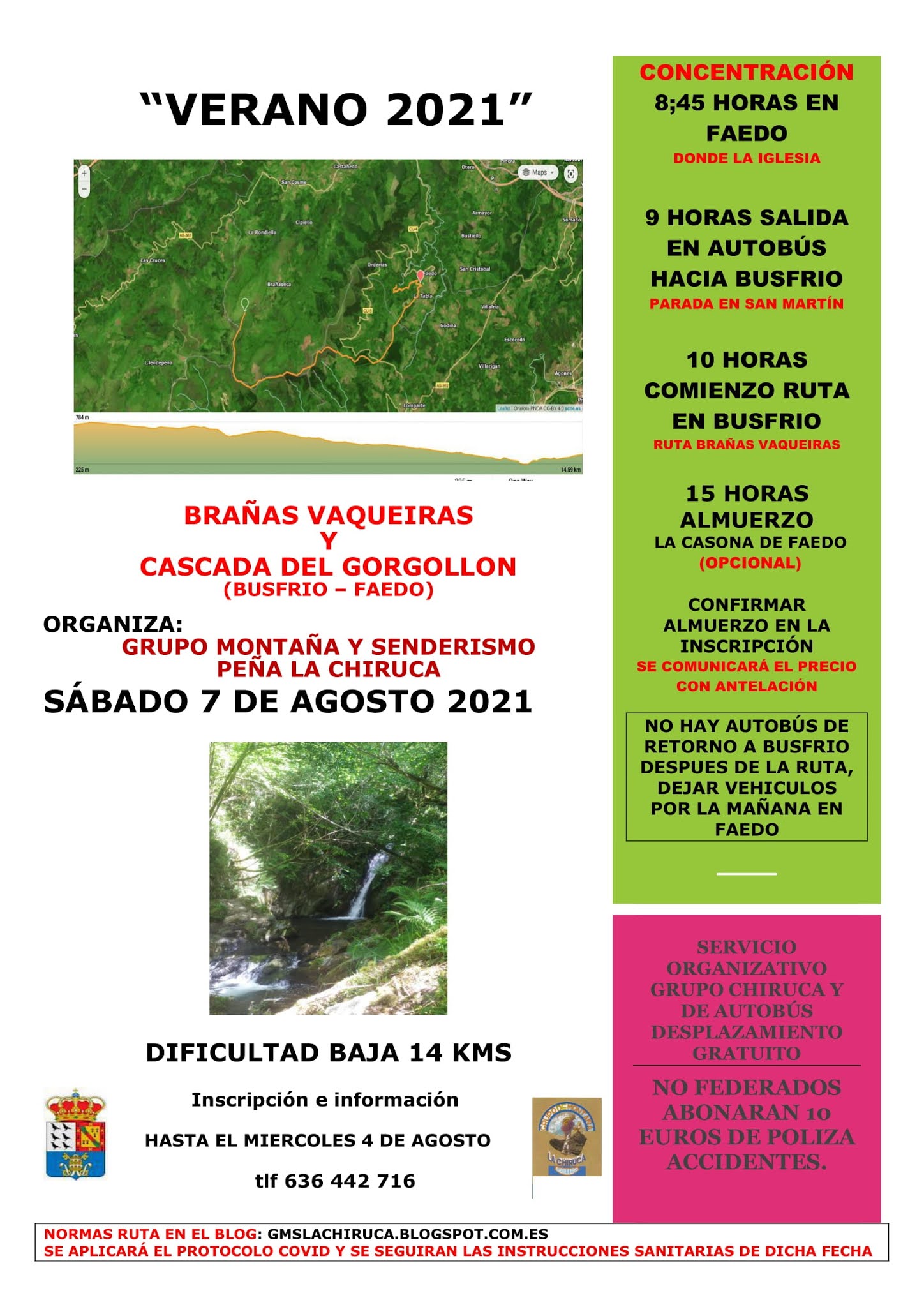 A las 10 horas comenzaremos la ruta de Las Brañas Vaqueiras en su entrada de Busfrio (PISTA EOLICOS) para poner rumbo a la zona de La Bordinga y Sangreña para bajar a la zona de Orderias por donde los depósitos de consejería y bajar a Faedo por donde la ermita de San Isidro y realizar la circular de la Cascada de Gorgollon.