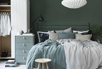 Se llevan los colores grisáceos en decoración! En este dormitorio han utilizado el verde grisáceo que además de elegante, es acogedor y relajante. Esta combinación es perfecta, blancos, madera natural y lino en los textiles.