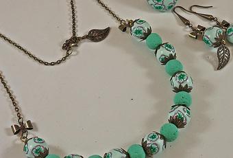 Conjunto compuesto de gargantilla, anillo y pendientes en tonos verde agua, Con bolitas efecto lava y todo montado en tono oro envejecido. Espero que os guste.
