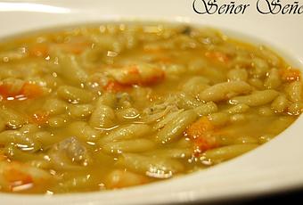 - Colar por un chino el caldo de cocer los gambones y echar con las verduras. Cocer 2-3 minutos.