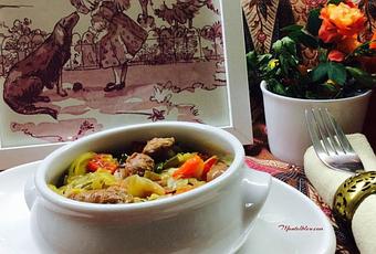 5 salchichas de pollo, 1 puerro, 2 cebollas, 1 pimiento verde italiano, 1/2 pimiento rojo, aceite de oliva, sal y 1 toque de pimienta.