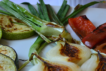 Untamos una plancha con aceite y asamos las verduras en ella.