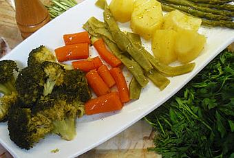 - Introducir toda la verdura en la olla procurando poner las judías en el fondo de la rejilla, luego las patatas y zanahorias, y posteriormente los espárragos. Damos un toque de sal y espolvoreamos el perejil.