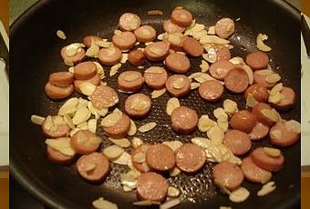 Cubrimos el fondo de una sartén con aceite y calentamos a fuego alto. Cuando esté caliente echamos dentro las almendras y las salchichas cortadas en rodajitas finas. Salteamos unos minutos hasta que empiecen a tener buena pinta mmmm.