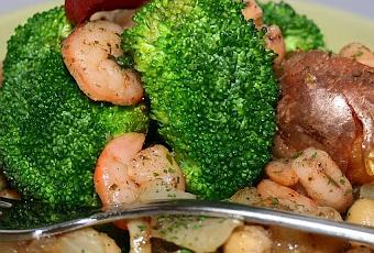 Llegados a este punto, tan solo nos resta un último paso antes de disfrutar de esta exquisita receta de vegetales. Antes de servir los alimentos, daremos un golpe de calor a los garbanzos y los saltearemos durante unos tres minutos. Listo amigos, ya podemos degustar la receta de cocina del día de hoy, servimos el brócoli, las gambas, la cebolla y la patata en un bol y rodemos los ingredientes con los garbanzos salteamos. Añadimos unas gotitas de aceite y servimos este delicioso plato acompañado de un buen vino tinto. Añadiremos opcionalmente salsa de soja a nuestras verduras, hortalizas y legumbres.Y aquí está el resultado de esta sana receta, un espectáculo para el paladar, un placer culinario con un bajo aporte calórico.