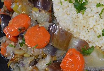 que añadiremos a las verduras, subimos el fuego, para darle un pequeño hervor y rectificamos de sal.Servir las verduras en círculo con el couscous en el centro del plato, espolvorearlo todo con el perejil picado.