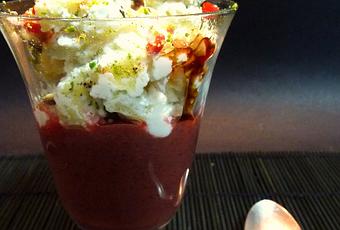 Consideraciones:La idea es el contraste de temperaturas y texturas. La remolachano debe estar muy gelificada y debe estar fría para contrastar con la mezcla de calabacín y requesón más calentitos.