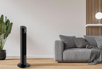 Otro modelo relevante es el ventilador de torre digital Midea MF-T40DBK, que también cuenta con un ángulo de oscilación de 60°, lo que posibilita refrescar espacios rápidamente. Su panel digital integrado facilita la selección de velocidades y los modos de brisa: natural, nocturno y normal. Asimismo, posee un modo bebé, lo que proporciona un flujo de aire suave y silencioso para garantizar un descanso sin interrupciones. Como si fuera poco, cuenta con un temporizador programable de hasta 7 horas, control remoto y apagado automático.