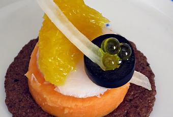 Para montar el plato se coloca de base un Crackers de aceitunas negras “Olive Party Time” de PAUL AND PIPPA. Se coloca una rodaja de boniato. Encima se pone la lasca de bacalao, el trozo de gajo de naranja, la rodaja de aceituna negra, la juliana de cebolla y unas esferas de Caviar de Aceite de Oliva Virgen Extra de LA CHINATA.