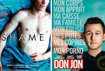 Ambas películas están escritas por los directores, -en el caso de Shame, co- escrita con Abi Morgan, guionista inglesa- y cada una tiene como protagonista, a hombres individualistas, subordinados por el sexo, con un estilo de vida sin compromisos, que gira entorno a sus logros, la tecnología y el culto a su propio ego. Shame y Don Jon, comparten el concepto del narcisismo, que no sólo está presente en cada uno de los personajes sino en una sociedad que se alimenta de las ideas freudianas de autoerotismo, igualmente, aunque parezca ajeno, el concepto de religiosidad o de perdón cristiano - que en Don Jon es bastante obvio- va a hacer parte de la narrativa y su misma progresión dramática. Las dos películas o los personajes de éstas, viven en una constante contradicción, a pesar de su éxito o de tener una vida acomodada -no son personajes Bukowskianos- están insatisfechos con ésta, la pornografía es su tesoro más valioso y la compulsión sexual, se satisface de cualquier forma; cada actividad, cada acción está en torno al sexo, a su individualidad y aparente hedonismo.