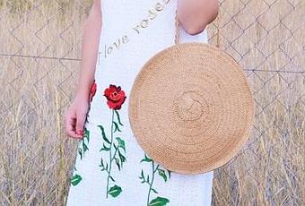 El look que os muestro a continuación es un look de oficina. Un vestido de corte clásico de color blanco con rosas bordadas en la parte delantera. Para complementar el outfit unas sandalias verdes y un bolso redondo de rafia.