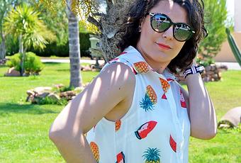 Hoy os muestro un outfit de lo más fresco. Y digo fresco por dos razones: una porque el tejido del vestido con frutas es muy ligero y es perfecto para los días de calor sofocante, y dos porque el estampado de piñas y sandías del vestido camisero es de lo más veraniego y son frutas muy refrescantes.