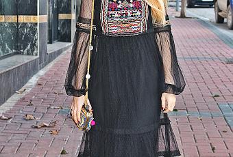 El vestido es de pumeti y lleva unos bordados étnicos muy bonitos. Normalmente no suele gustarme como me queda la medida midi pero en este caso al ser transparente el efecto visual es diferente.