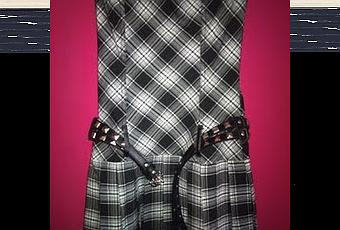 También tengo ropa menos siniestra y más informal. El vestido que aquí veis tiene un estilo muy desenfadado, con escote palabra de honor, sin opción a poner tirantes, falda corta plisada, estampado de cuadritos y viene con un cinturón de tachuelas, que puedo sacar para usar con otra ropa. Queda bien en invierno con botas altas de cuero, pero queda aún mejor en verano con wambas negras y calcetines blancos, o con francesitas con calcetines... bueno, la cosa es llevar calcetín blaanco y así dar imagen de uniforme escolar, algo que rejuvenece y da gracia al conjunto, ahora que la moda común es ir vestida como una señora mayor. Lo compré hace varios años en NewYorker por 25 euros o algo así, pero creo que se siguen vendiendo modelos parecidos.