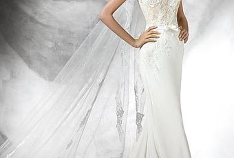 Octubre llega de la mano de la firma Pronovias para nuestros vestidos de la semana. Nos adentramos en la colección Pronovias 2016 para traeros el modelo Tais, un vestido de estilo evasé de gasa, encaje y guipur con interior de color nude. Su cuerpo de encaje cuenta con escote barco y transparencias que forman un nuevo de escote, esta vez corazón. La espalda nos deja un precioso escote en V y nos encanta su pequeño cinturón de grosgrain en el talle con un lacito.