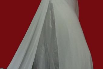 Vestido de novia. El vestido es de muselina y razo color blanco con galón en la cadera de tul bordado. Posee un corset y una doble pollera (capa de razo y capa de musellina) y un tajo que deja ver el la pollera de abajo.
