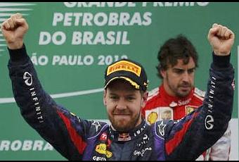 | Vettel festeja su 13ª de la temporada en Brasil. Detrás suyo, Alonso - Reuters. |