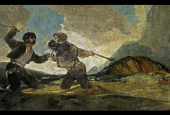 Pero las referencias mitológicas no acaban aquí, ¿pues qué son los cantos de sirena sino otra alusión a la cultura griega? Tampoco Velázquez es el único pintor invitado a tomar parte en la letra, puesto que cerca del minuto 1:20 se habla de "muerte a garrotazos, una estampa muy goyesca". Sin duda lo es y hace referencia a Duelo a garrotazos, una de las famosas "Pinturas negras" de Goya.