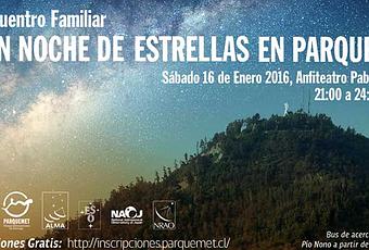 Este sábado 16 de enero a las 21:00 horas se realizará la sexta versión del evento “Gran Noche de Estrellas en el Parque Metropolitano”. En vista del gran éxito obtenido en versiones anteriores –más de 5.000 personas han asistido–, ALMA y Parquemet se unen nuevamente para ofrecer a las familias un acercamiento gratuito a las estrellas y aprender del Universo desde el cerro San Cristóbal de Santiago.